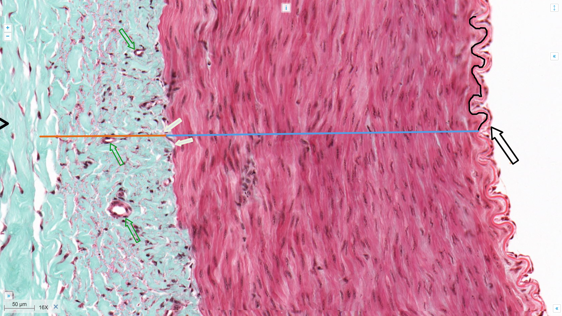 De middelgrote arterie is op zwakke vergroting te herkennen aan een dikke spierlaag. Bij hogere vergroting zijn drie lagen te onderscheiden: