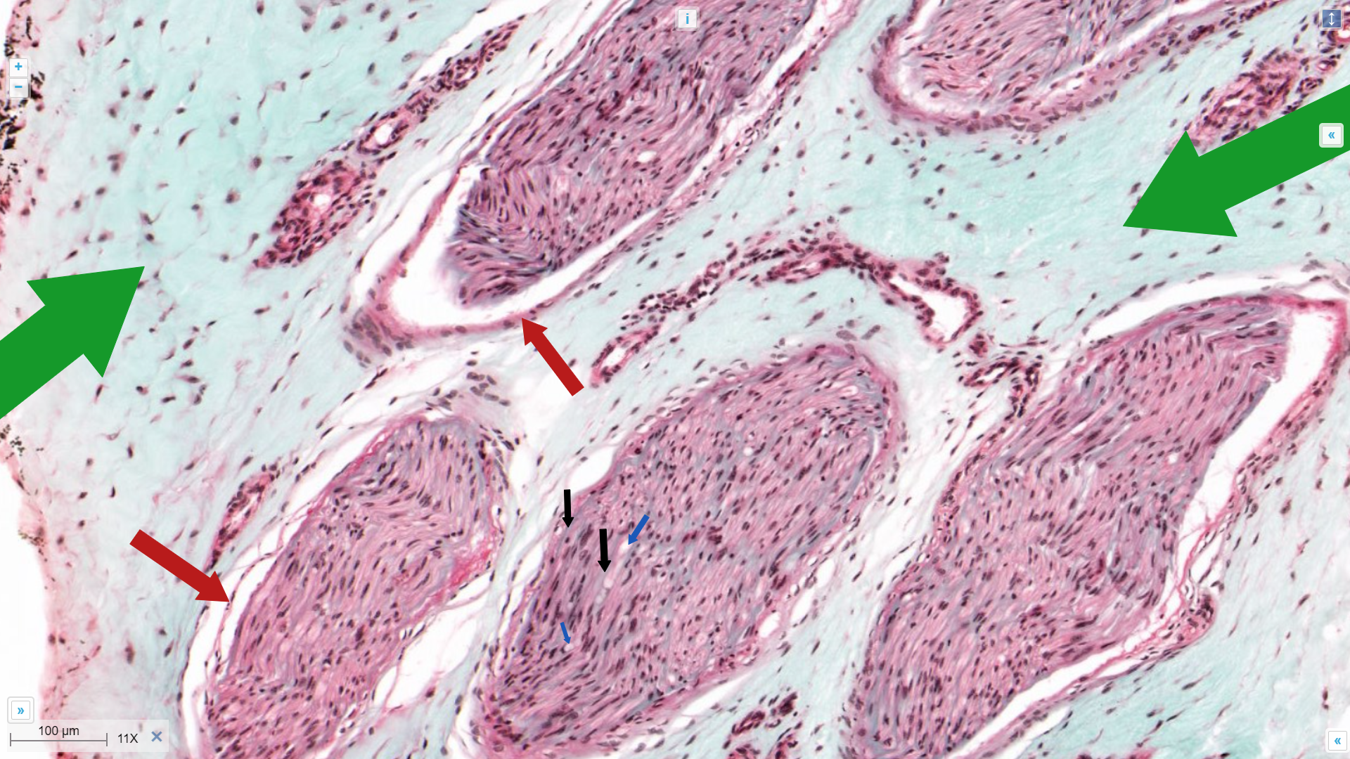 Het histologisch preparaat toont een doorsnede doorheen een vaat-zenuw streng bestaande uit bindweefsel, zenuwbundels (rode pijl), een middelgrote spierarterie (zwarte pijl) en twee middelgrote venen (groene pijl).